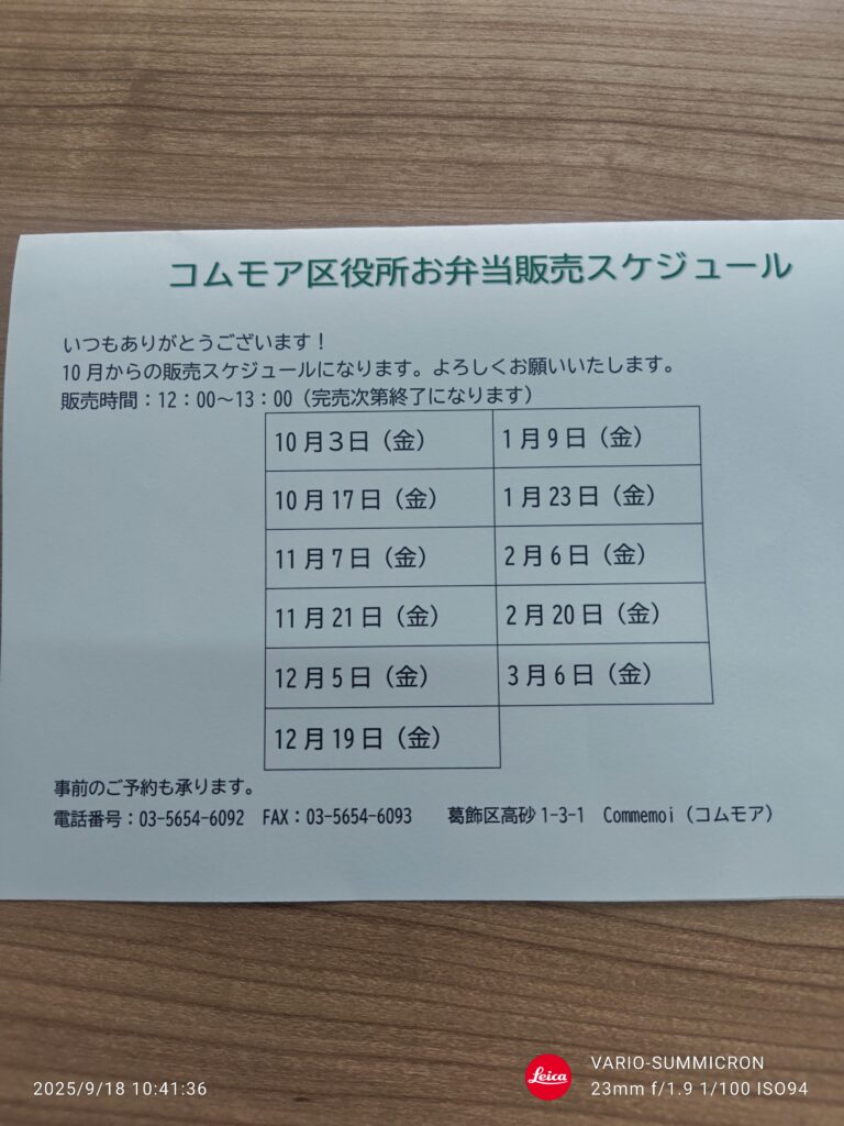 10月からの区役所お弁当販売日 2025.09.18 250918104135701 葛飾区役所区民ホールでのお弁当販売日が決まりました。ご来場お待ちしています。 事前予約も承っております。ご連絡お待ちしています。