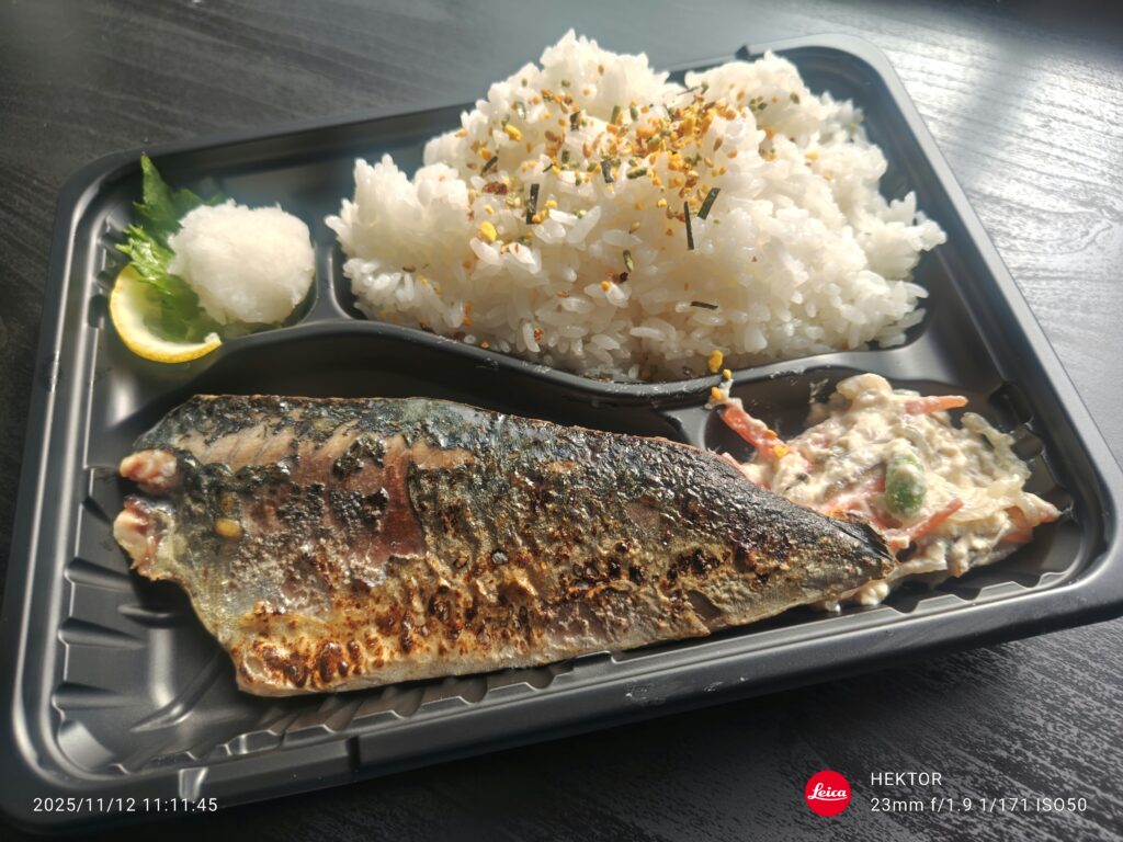 今日のお弁当は「塩サバ弁当」です。11時45分より販売します。ご来店お待ちしています。