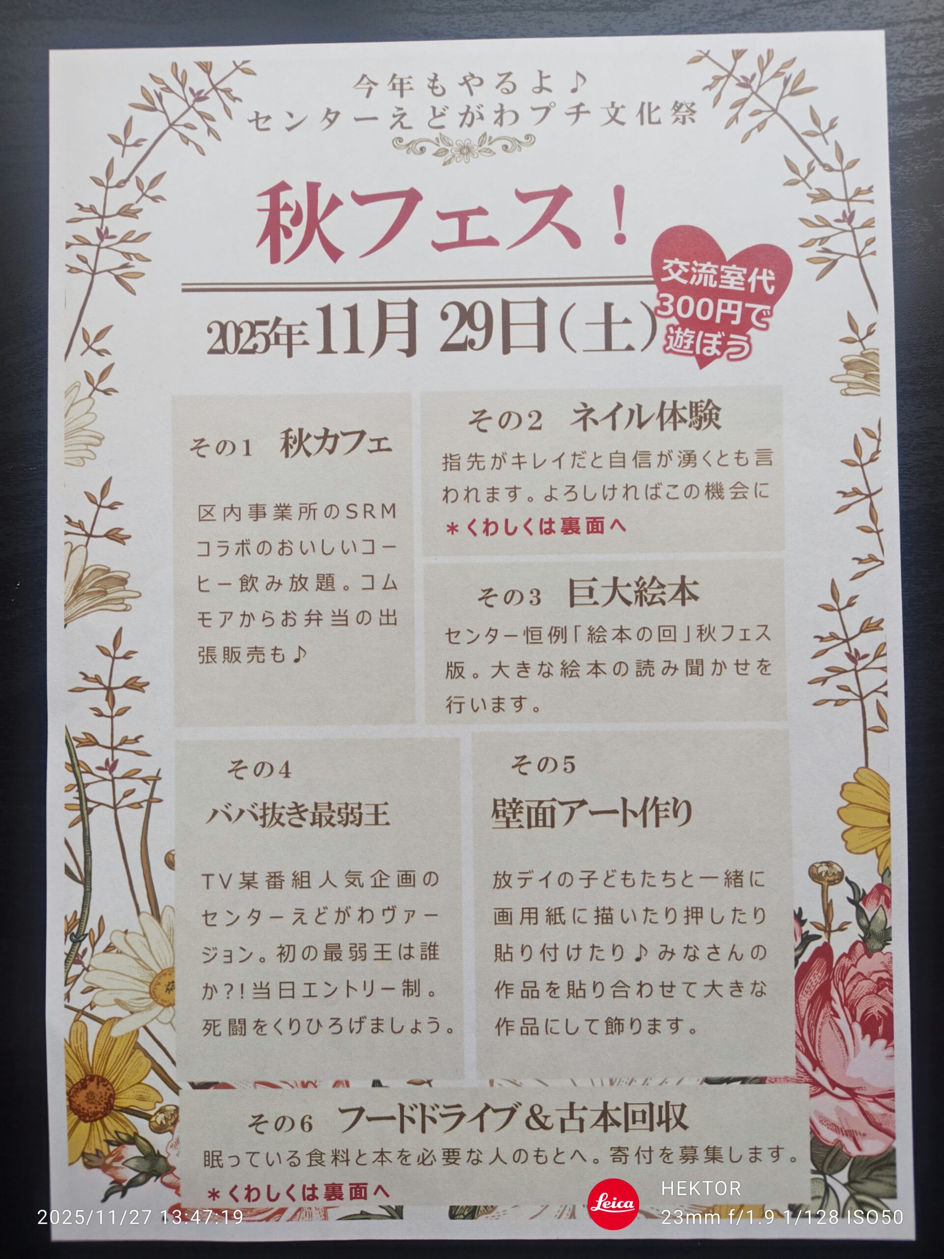 11月29日土曜日は、センターえどがわの「秋フェス」にお弁当販売で参加します。好評いただいている「唐揚げ弁当」を販売します。お弁当販売時間は11時30分から13時30分です。お近くの方ぜひご来場お待ちしています。