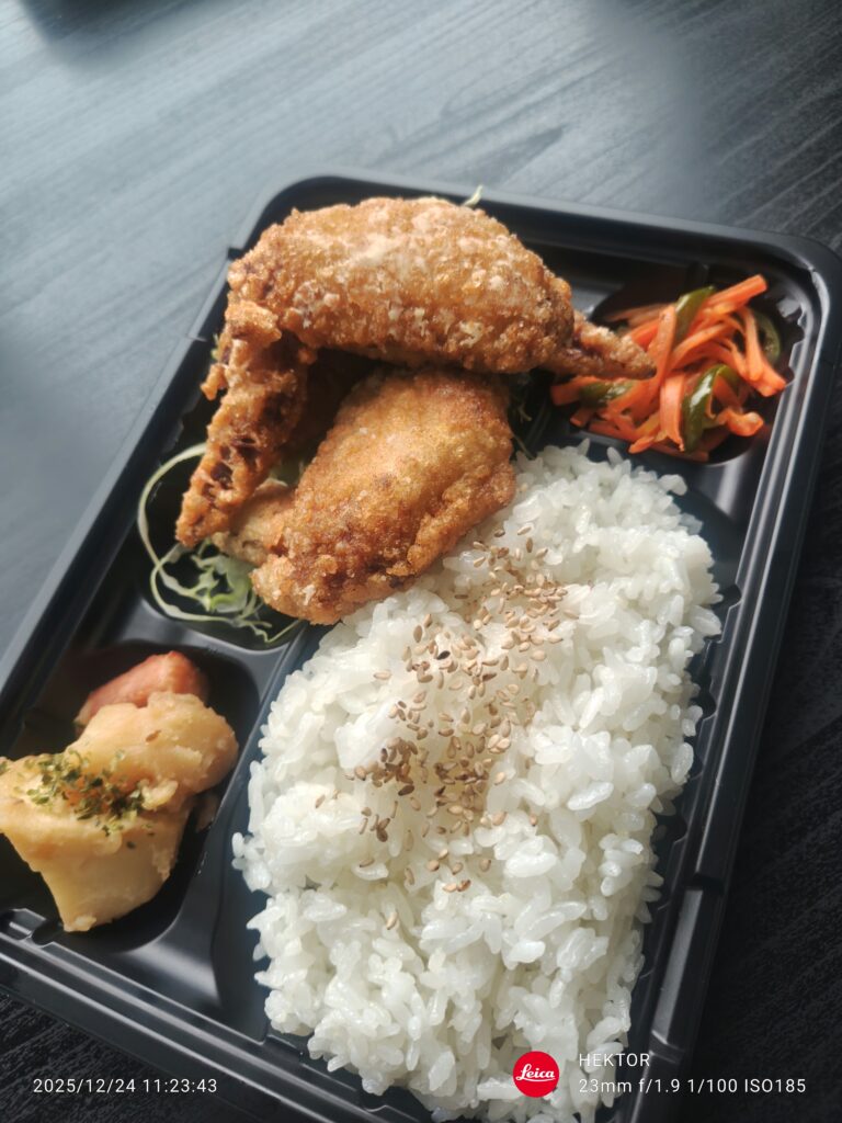 12月24日お弁当販売日 2025.12.24 今日のお弁当はクリスマスイブなので、皆さんチキンが食べたいかなと、手羽先の唐揚げをお弁当にしました✨生憎のお天気ですが11時45分から店頭で販売致します、ご来店お待ちしています。 251224112341683