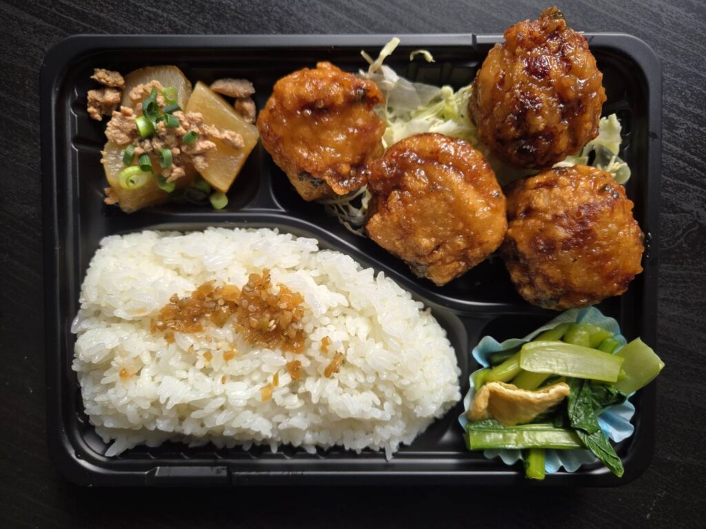 「鶏唐揚げ梅ダレ弁当」です。区役所販売にはお惣菜として「大根のそぼろ煮」も持ってきたいきます。ご来場お待ちしています。