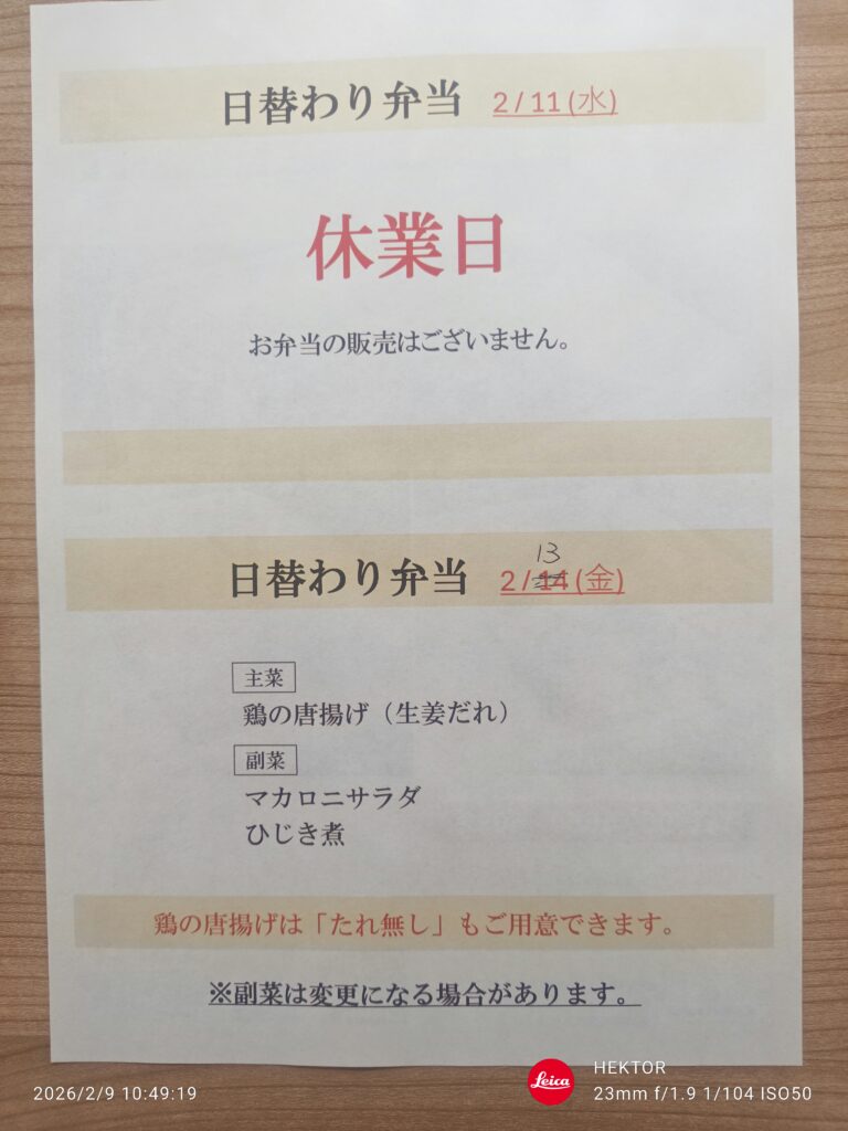 今週のお弁当販売 2026.02.09 260209104918402 今週水曜日は祝日の為お弁当販売はありません。13日金曜日は「鶏唐揚げの生姜ダレ」弁当を販売いたします。よろしくお願いします。 施設近隣にお配りしたチラシで日にちの間違いがありました、2/14(金)となっていますが、13日(金)の間違いです。申し訳ありませんでした。