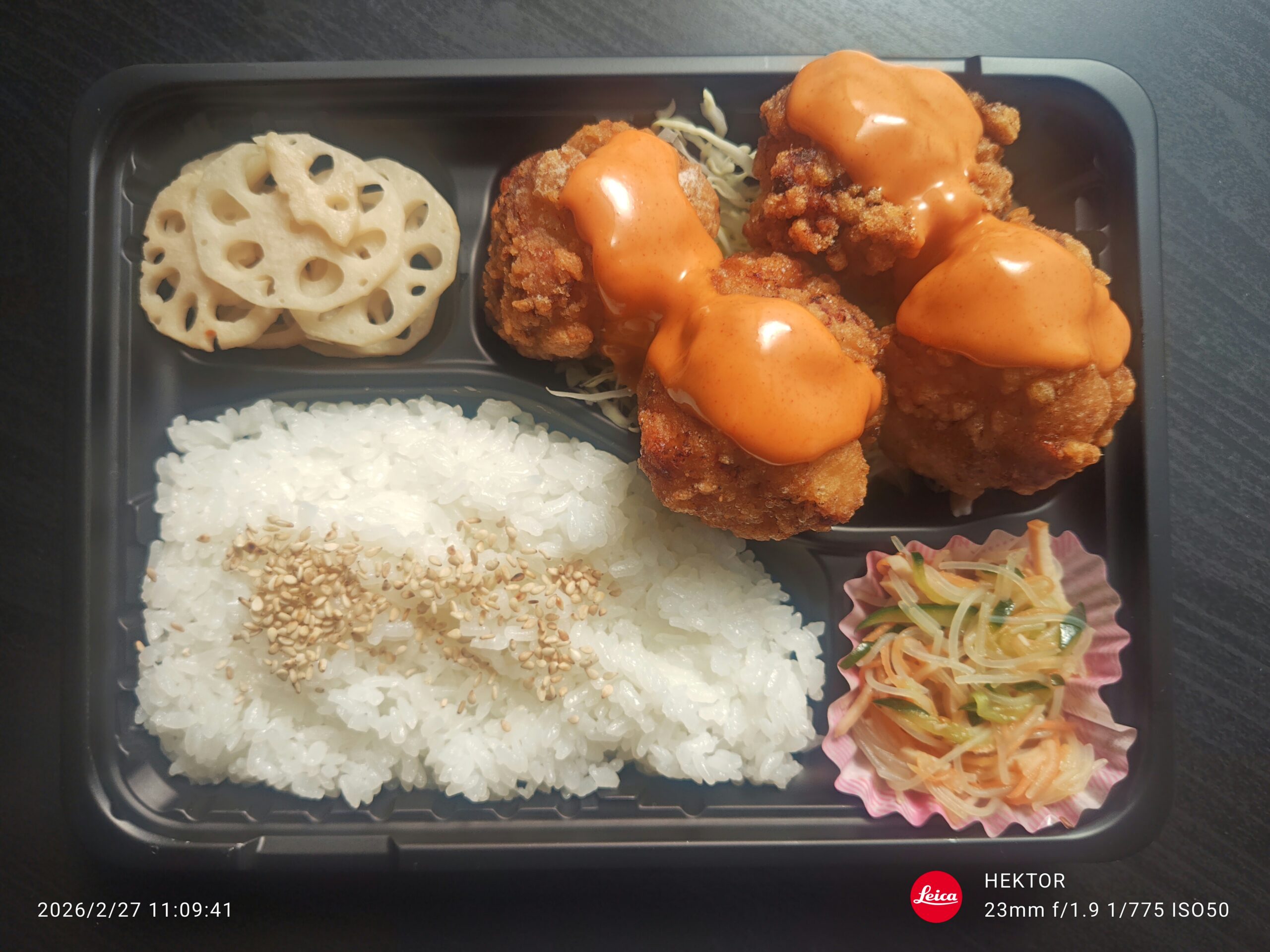 本日のお弁当 2026.02.27 260227110941081 「鶏唐揚げのコチュジャンマヨネーズ」弁当です。旨辛サッパリ味煮仕上げました。 11時45分〜13時まで店頭にて販売いたします。ご来店お待ちしています。
