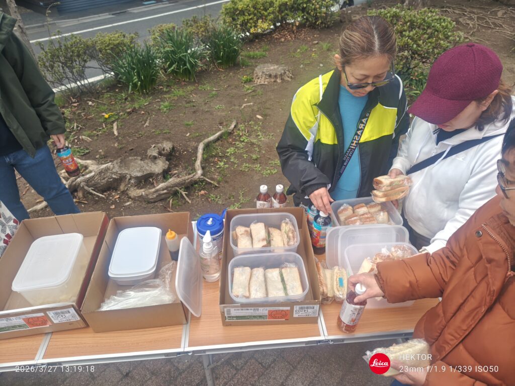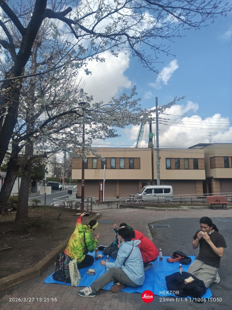 お花見 2026.03.27 本日は近くの公園にお花見に来ました。普段施設内で、まかないを食べてますが、お花見として野外でお花見をかねて食べます。 260327131916236 260327132153115 コムモア名物のカツサンドをみんなでほおばりました。